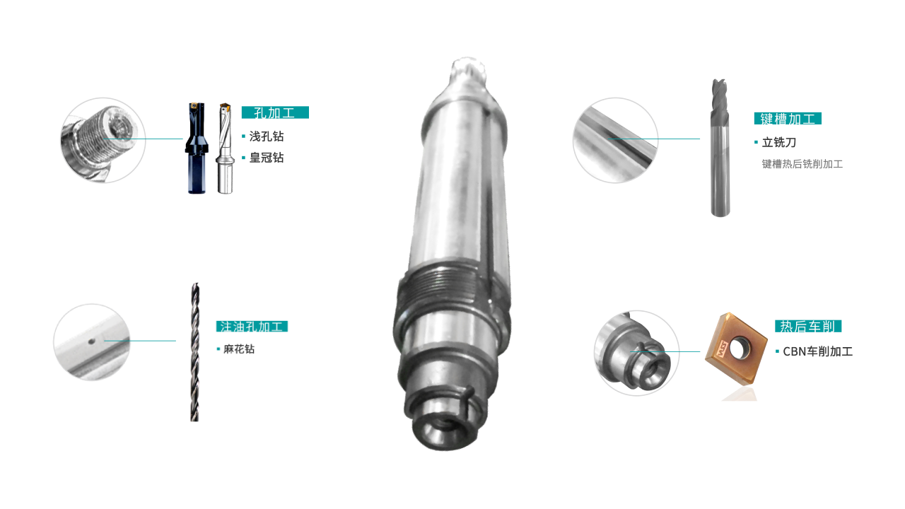 WSS bietet Dreh-, Fr?s- und Lochwerkzeuge für die Komplettbearbeitung von Motorwellen mit h?herer Stabilit?t und Zuverl?ssigkeit an, die nicht nur die hohen Anforderungen an die Ma?genauigkeit für ?lgefüllte Bohrungen, Passfedernuten und flache Bohrungen in Motorwellen erfüllen, sondern auch eine hohe Oberfl?chenqualit?t nach dem CBN-Hartdrehen bieten.